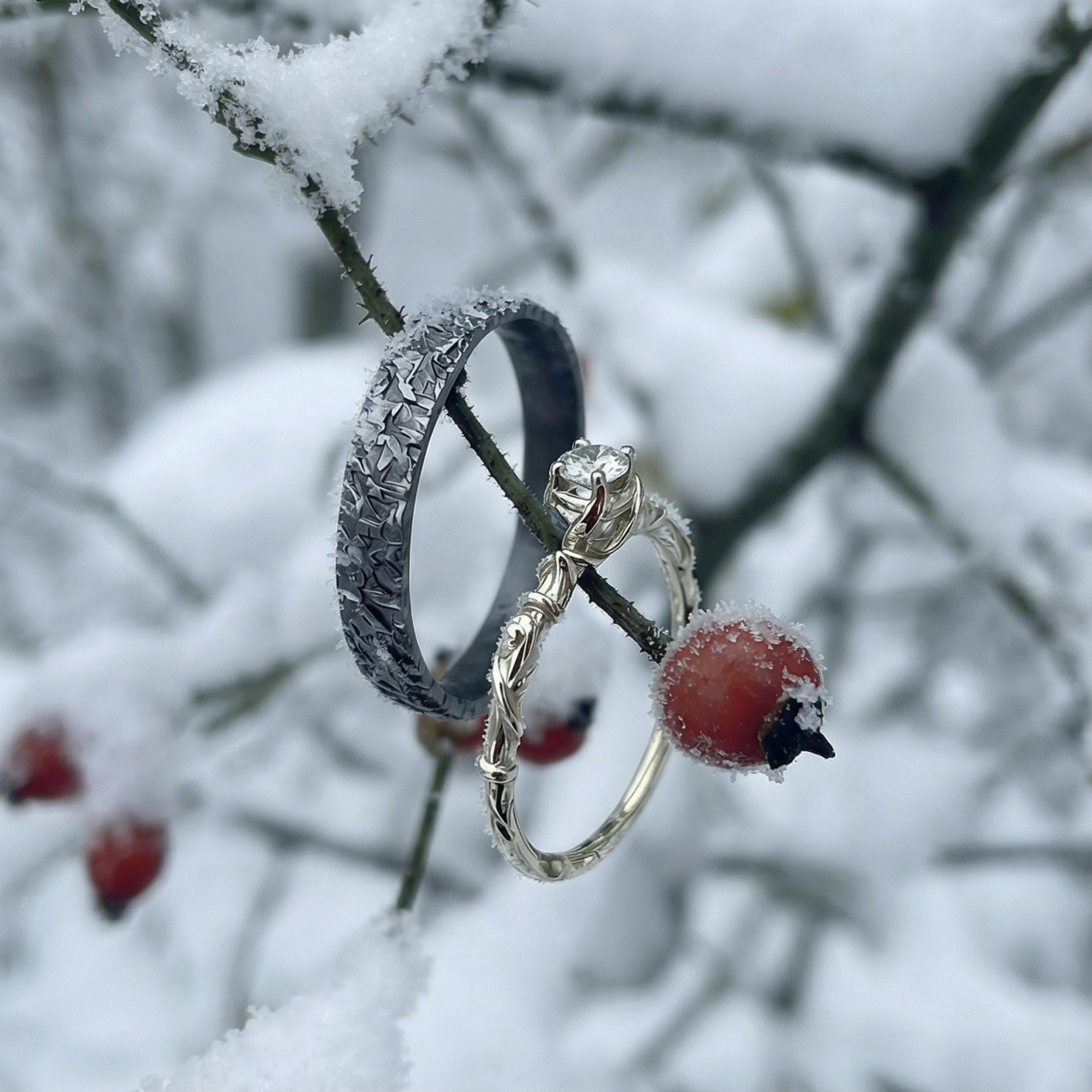Wenn der Ritter sein Dornröschen gefunden hat, fängt das schöne Leben an. All diese Romantik findet sich in diesem Ringpaar wieder. Der Damenring als Solitär verarbeitet, ist das filigrane Gegenstück zum maskulinen und sehr kraftvollen Herrenring.