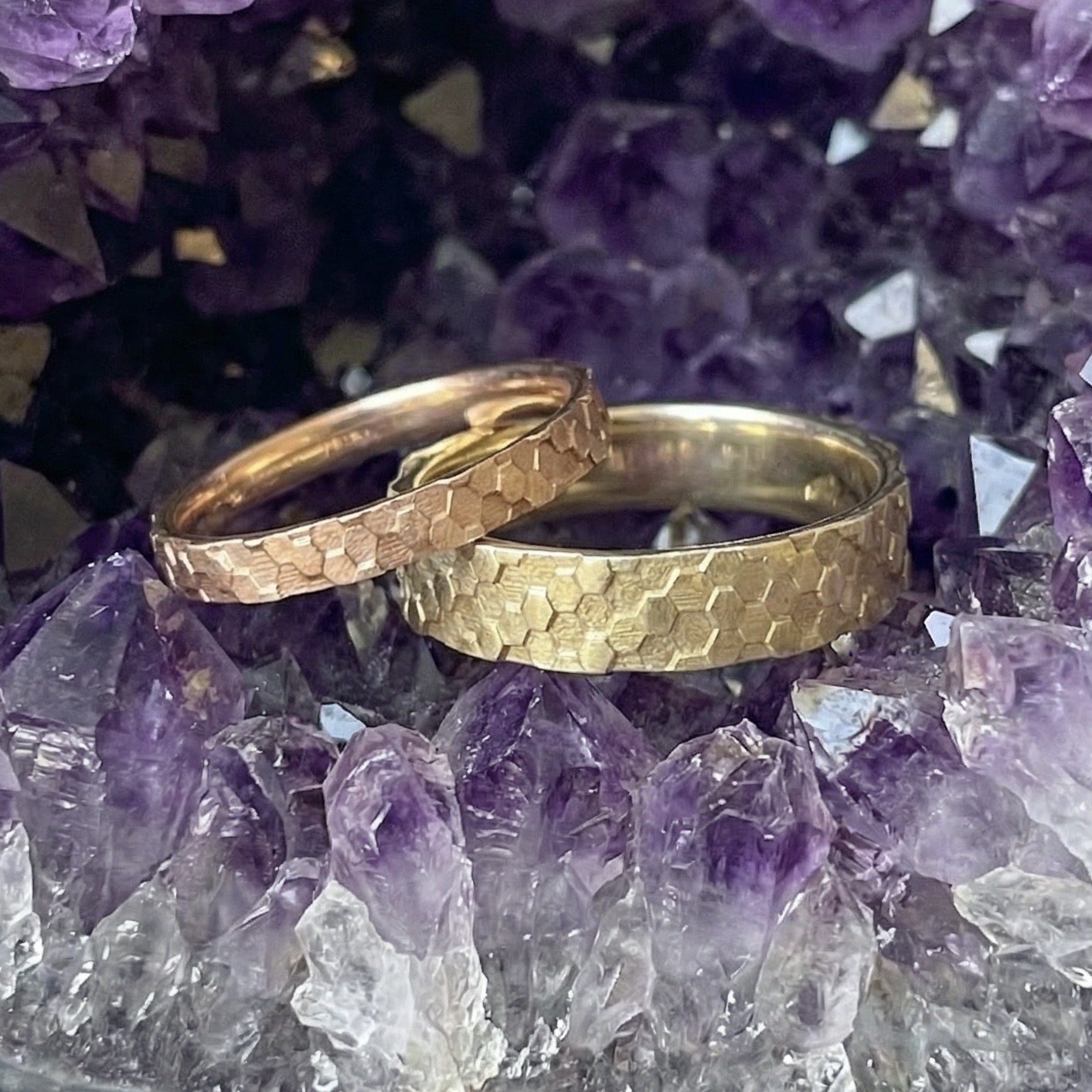 Natürlich kommt man als Goldschmied nicht umhin, zusammen mit der Natur schöne Schmuckstücke zu entwerfen und so entstand auch dieses schöne Ringpaar. Streicht man mit dem Finger über die Oberfläche dieser Trauringe, spürt man das Auf und Ab der Prismen. Feinste Goldschmiedearbeit trifft hier auf höchste Präzision.