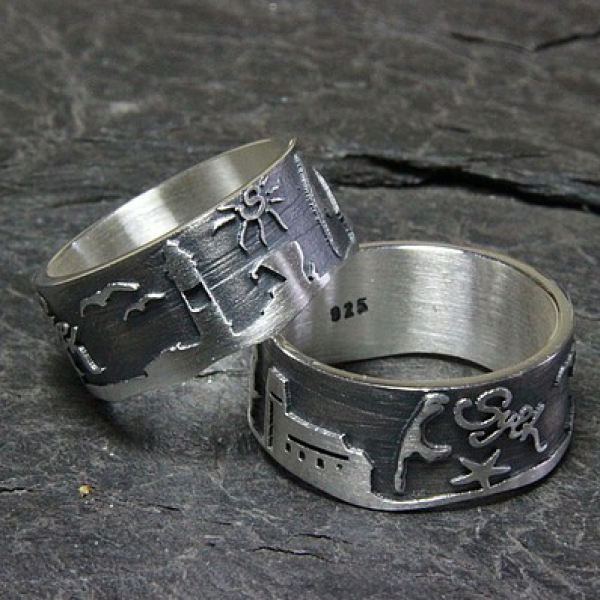 Dieser schöne Ring, mit Motiven der friesischen Nordseeinsel Sylt, ist aus 925/- Sterlingsilber gearbeitet. Er ist ca.1cm breit und ca. 1,8mm stark.
